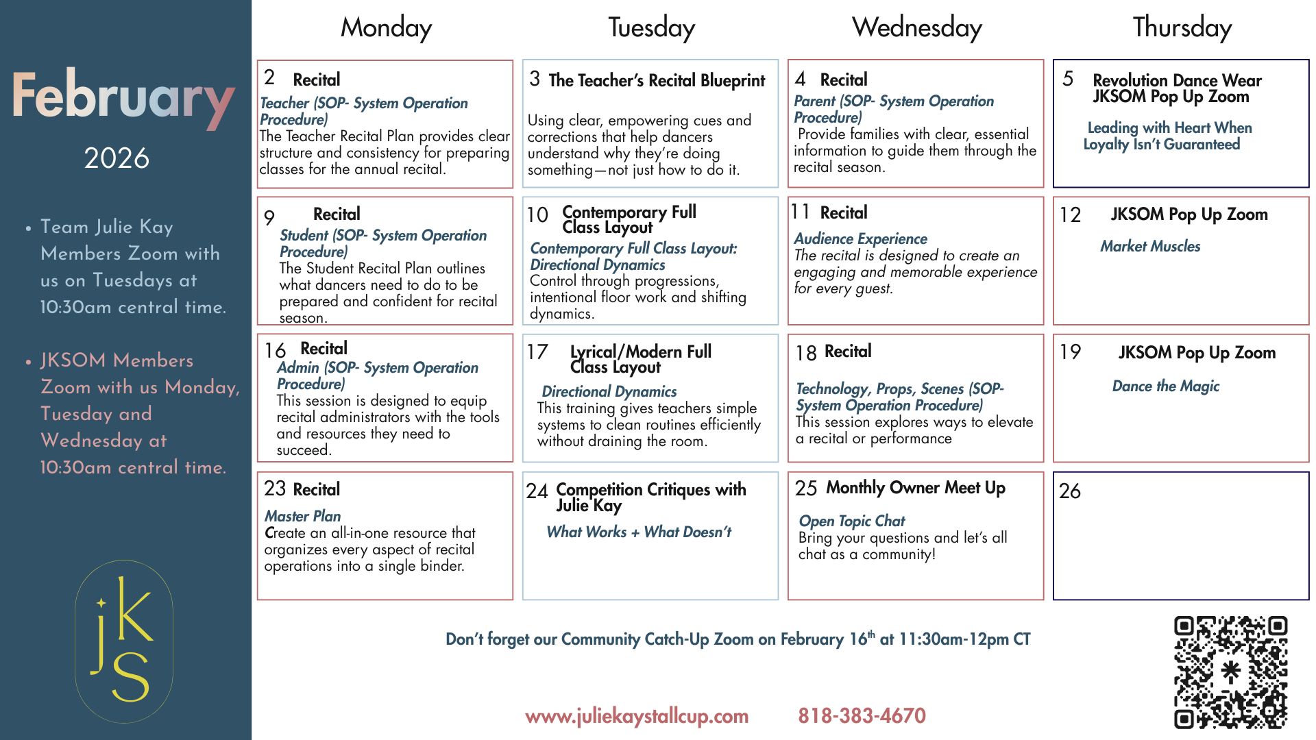 Julie Kay is deeply appreciative of all the gifts that God has graced her with. Her ambition is to guide and support teachers and studio owners to create joy within their life, find balance, share the gift of dance and remember to always “Hold the Vision and Trust the Process.”